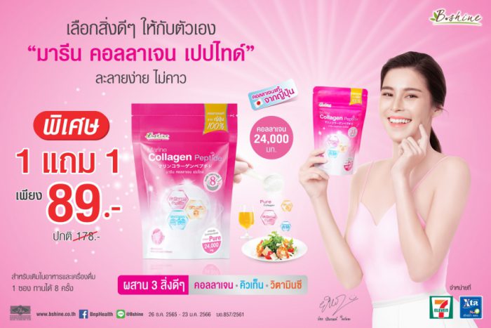 โดย “บีไชน์ มารีน คอลลาเจน เปปไทด์” ขนาดซองบรรจุ 24,000 มิลลิกรัม ทานได้ 8 ครั้ง จัดโปรโมชั่นสุดคุ้มพิเศษ ซื้อ 1 ซอง แถมฟรีอีก 1 ซอง เพียง 89 บาท จากปกติราคา 178 บาท ตั้งแต่วันนี้ – 23 มกราคม 2566 หาซื้อได้ที่ร้านเซเว่น อีเลฟเว่น ทุกสาขาทั่วประเทศ